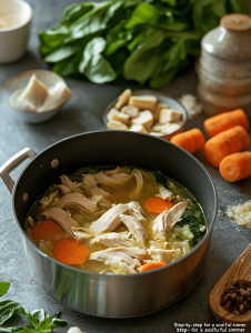 Step 5: Pour in chicken broth, bring to a gentle simmer—watch for tiny bubbles and a fresh, herby aroma.